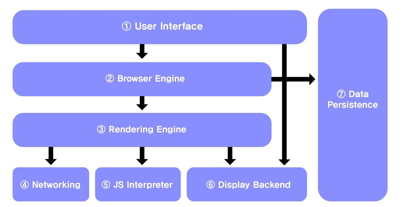 위와 같은 일련의 과정을 수행하는 요소는 브라우저의 랜더링 엔진이다. 랜더링 엔진은 HTML과 CSS를 파싱하여 화면을 표시한다. 사용자의 접속부터 브라우저가 하나의 페이지를 파싱하기까지 필요한 브라우저의 주요 구성 요소는 총 7가지로 (1)유저 인터페이스, (2)브라우저 엔진, (3)랜더링 엔진, (4) 네트워크, (5) 자바스크립트 해석기 (6) UI 백엔드 (7)데이터 저장소로 구성되어 있다.