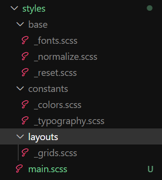 3. 기본적인 폴더 구조를 잡는 단계. scripts에 쓰여진 경로와 같이 styles 폴더를 만들어 sass파일들을 작성하였다.