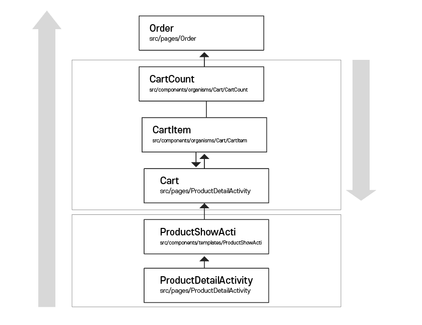 마지막으로 정리하자면, ProductDetailActivity 페이지에서 일어난 Actions을 Cart 페이지가 전달받고, Cart에서 상태변화(수량 감소, 증가, 삭제)이 일어나면 CartItem에서 이벤트핸들러를 실행하여 Cart에 전달, 상위함수를 실행하고 cartData의 상태를 변경시킨다. 실시간으로 변경된 상태는 CartCount 컴포넌트에 반영되고 이 데이터를 Order페이지로 넘겨 결제 모듈에 전달한다.