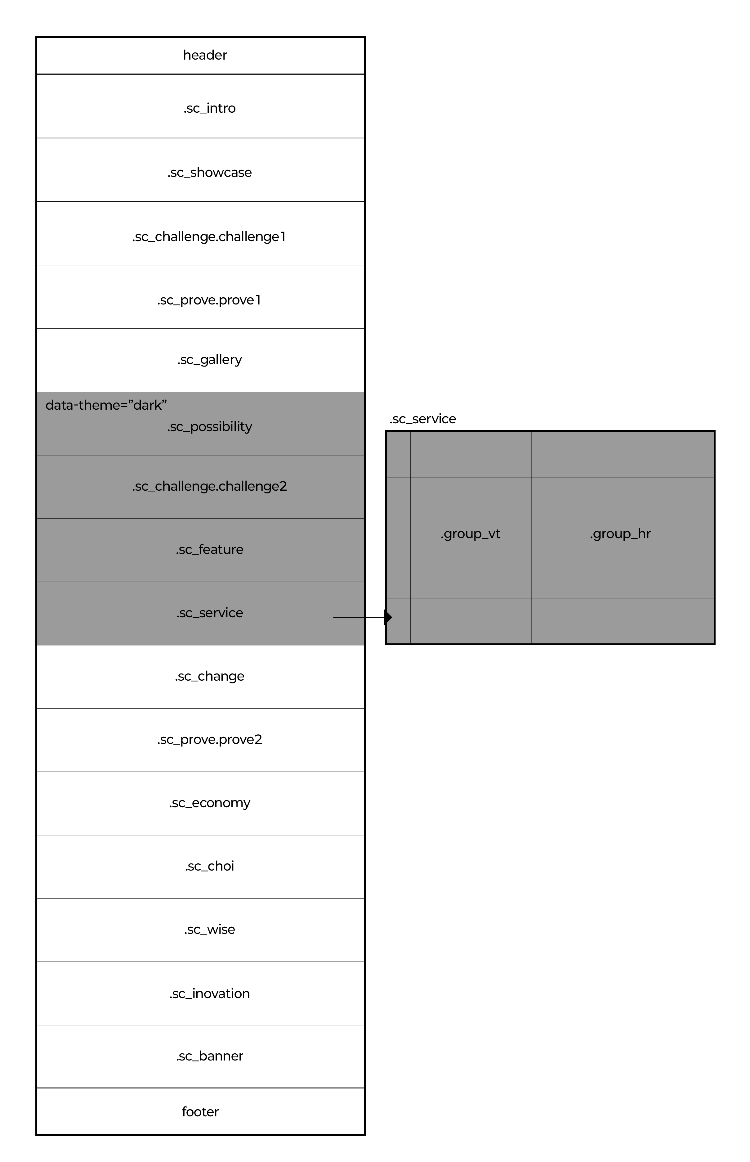 컨텐츠 영역에 섹션이 16개 들어갔으며, 중간에 div로 묶어준 section에 data-theme="dark"를 적용하였다. 또, .sc_service 섹션 같은 경우 인터랙션에 용이하기 위해 내부에 수직 컨텐츠와 수평 컨텐츠를 따로 묶어주었다. 클론을 하면서 GSAP을 활용한 스크롤 인터랙션을 구사하는 것에 중점을 두었다. 본 포스팅에서 스크롤 인터랙션 시나리오를 간단하게 정리하고자 한다.