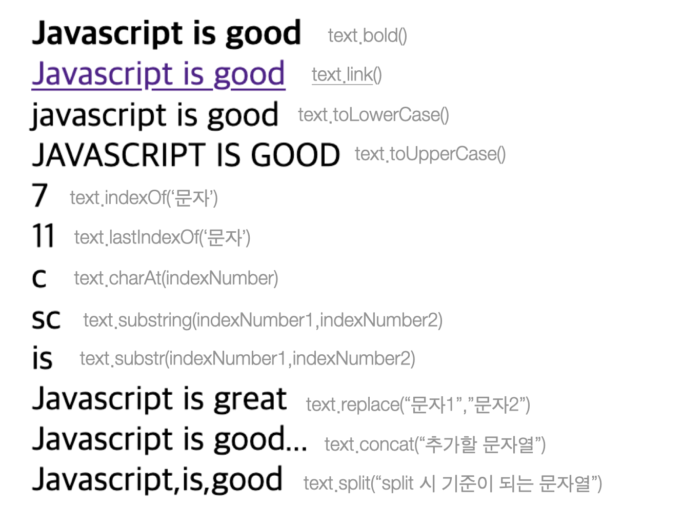 var 변수에 문자열을 넣는 방법은 두 가지로 아래의 코드 블럭과 같은데, var text = "Javascript is good"; 이라는 코드를 작성한 후 아래와 같이 String을 다루는 내장 메서드를 이용해보았다.